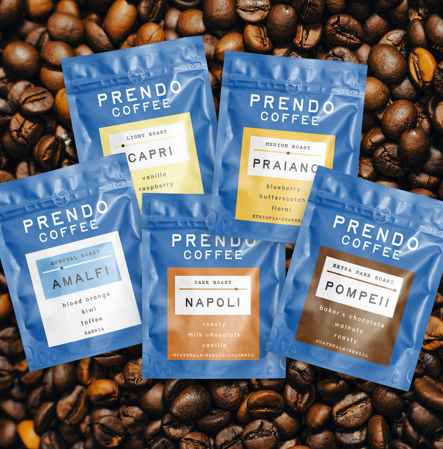 Discover the essence of Italy with our Deluxe Sample Pack, with all 5 roasts. Featuring Capri’s light, citrusy brightness, Napoli’s bold dark richness, Praiano’s smooth medium balance, Pompeii's roasty and nuttiness, and our special Amalfi single-origin's fruity bouquet. This showcase invites you to explore the full spectrum of Prendo flavor, perfect for gifting, tasting, or finding your new favorite daily roast.